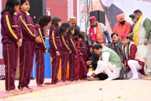 मुख्यमंत्री का कार्यक्रम स्थल के मुख्य गेट पर पांच कन्याओं द्वारा तिलक और पुष्प वर्षा के साथ स्वागत और अभिनंदन किया गया। इस अवसर पर मुख्यमंत्री ने पशुपालन विभाग के स्टॉल पर गिर प्रजाति की गौ माता का पूजन कर जनपदवासियों की खुशहाली, बेहतर स्वास्थ्य और समृद्धि की कामना की। स्टॉलों के अवलोकन के दौरान उत्तराखंड राज्य आजीविका मिशन के स्टॉल पर मुख्यमंत्री ने चरखा में कताई कर स्वयं सहायता समूह की महिलाओं का मनोबल बढ़ाया। उन्होंने विकसित भारत संकल्प यात्रा से लाभान्वित लाभार्थियों के साथ सीधा संवाद भी किया। मुख्यमंत्री ने मिट्टी के बर्तन और तुलसीमाला स्टॉल पर महिलाओं के इस स्वरोजगारपरक गतिविधि की सराहना करते हुए स्वयं भी इस पर अपना हाथ आजमाया और उन्हें इस कला को आगे बढ़ाने के लिए प्रोत्साहित किया। इस अवसर पर मुख्यमंत्री ने नव दुर्गा की प्रतीक कन्याओं का पूजन कर प्रदेश की सुख-शांति, खुशहाली, चहुमुखी विकास की कामना की।